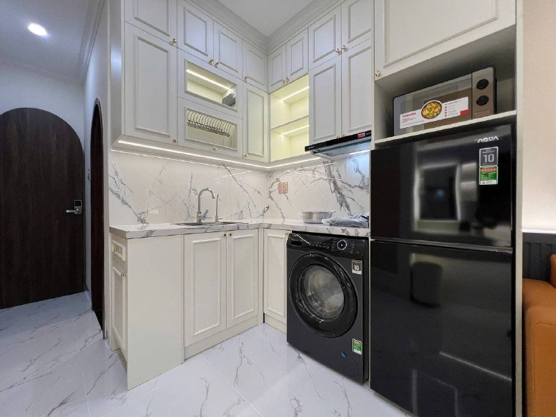 Студия с окном, лифт, вся необходимая мебель, холодильник, плита, кондиционер, телевизор, интернет, стиральная машина в квартире, уборка раз в неделю, парковка, спортзал, рядом магазины и кафе. Животные запрещены.