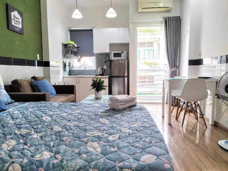 Студия с балконом, вся необходимая мебель, холодильник, плита, кондиционер, телевизор, интернет, стиралка. Уборка, смена белья. Рядом 5 район, магазины, кафе. Аренда: 9.000.000 vnd в мес. Депозит 1 месяц. Договор 6 месяцев. Электричество: 4.000 vnd/кВтч. Вода: 150.000 vnd с чел.