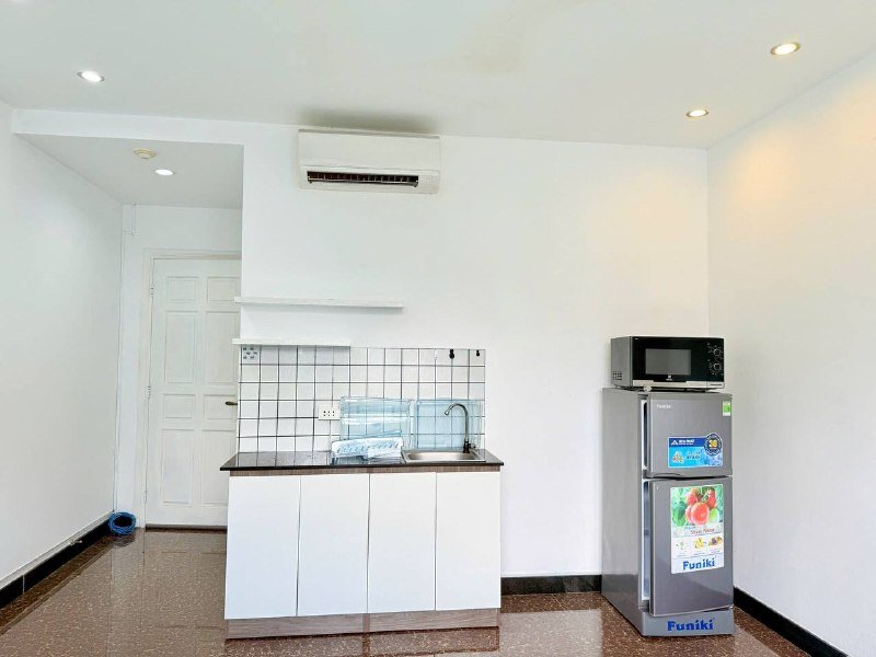 Студия с ванной, вся необходимая мебель, холодильник, кондиционер, телевизор, интернет, стиральная машина в общей зоне, уборка раз в неделю. Рядом магазины, кафе и кофейни. Плиты нет (обсуждаемо).
