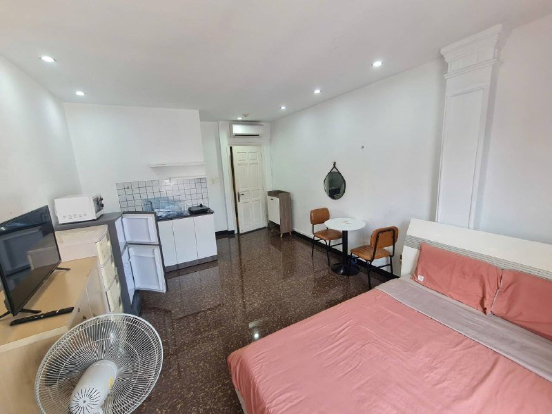Студия с ванной, вся необходимая мебель, холодильник, плита, кондиционер, телевизор, интернет, стиральная машина в общей зоне. Рядом магазины, кафе и кофейни.